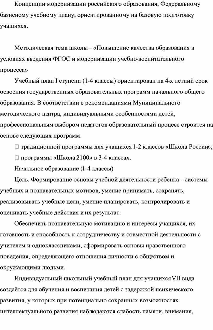 Концепции модернизации российского образования, Федеральному базисному учебному плану, ориентированному на базовую подготовку учащихся.