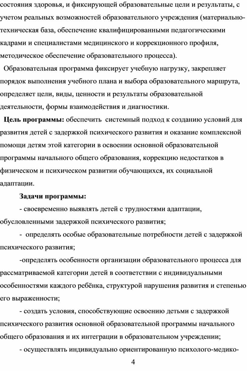 Цель программы: обеспечить системный подход к созданию условий для развития детей с задержкой психического развития и оказание комплексной помощи детям этой категории в освоении основной образовательной программы начального общего образования, коррекцию недостатков в физическом и психическом развитии обучающихся, их социальной адаптации.