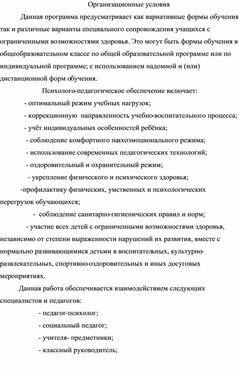 Данная программа предусматривает как вариативные формы обучения, так и различные варианты специального сопровождения учащихся с ограниченными возможностями здоровья. Это могут быть формы обучения в общеобразовательном классе по общей образовательной программе или по индивидуальной программе; с использованием надомной и (или) дистанционной форм обучения.