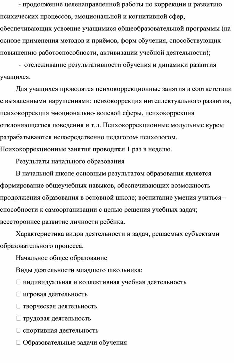 - продолжение целенаправленной работы по коррекции и развитию психических процессов, эмоциональной и когнитивной сфер, обеспечивающих усвоение учащимися общеобразовательной программы (на основе применения методов и приёмов, форм обучения, способствующих повышению работоспособности, активизации учебной деятельности);