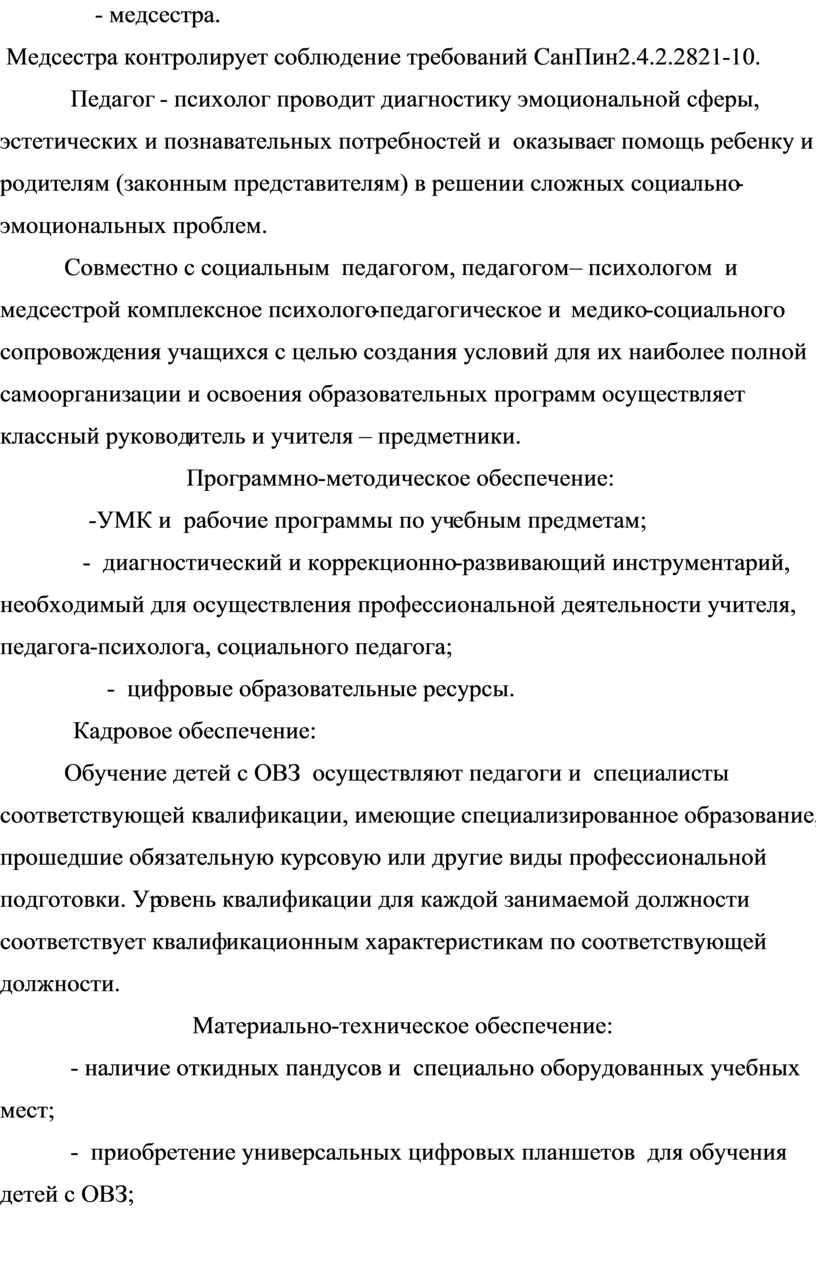 состояния здоровья, и фиксирующей образовательные цели и результаты, с учетом реальных возможностей образовательного учреждения (материально-техническая база, обеспечение квалифицированными педагогическими кадрами и специалистами медицинского и коррекционного профиля, методическое обеспечение образовательного процесса).