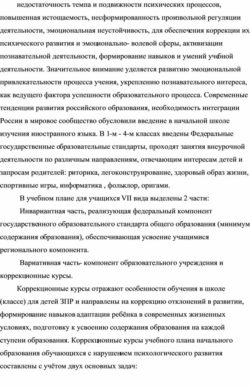 недостаточность темпа и подвижности психических процессов, повышенная истощаемость, несформированность произвольной регуляции деятельности, эмоциональная неустойчивость, для обеспечения коррекции их психического развития и эмоционально- волевой сферы, активизации познавательной деятельности, формирование навыков и умений учебной деятельности. Значительное внимание уделяется развитию эмоциональной привлекательности процесса учения, укреплению познавательного интереса, как ведущего фактора успешности образовательного процесса. Современные тенденции развития российского образования, необходимость интеграции России в мировое сообщество обусловили введение в начальной школе изучения иностранного языка. В 1-м - 4-м классах введены Федеральные государственные образовательные стандарты, проходят занятия внеурочной деятельности по различным направлениям, отвечающим интересам детей и запросам родителей: риторика, легоконструирование, здоровый образ жизни, спортивные игры, информатика , фольклор, оригами.