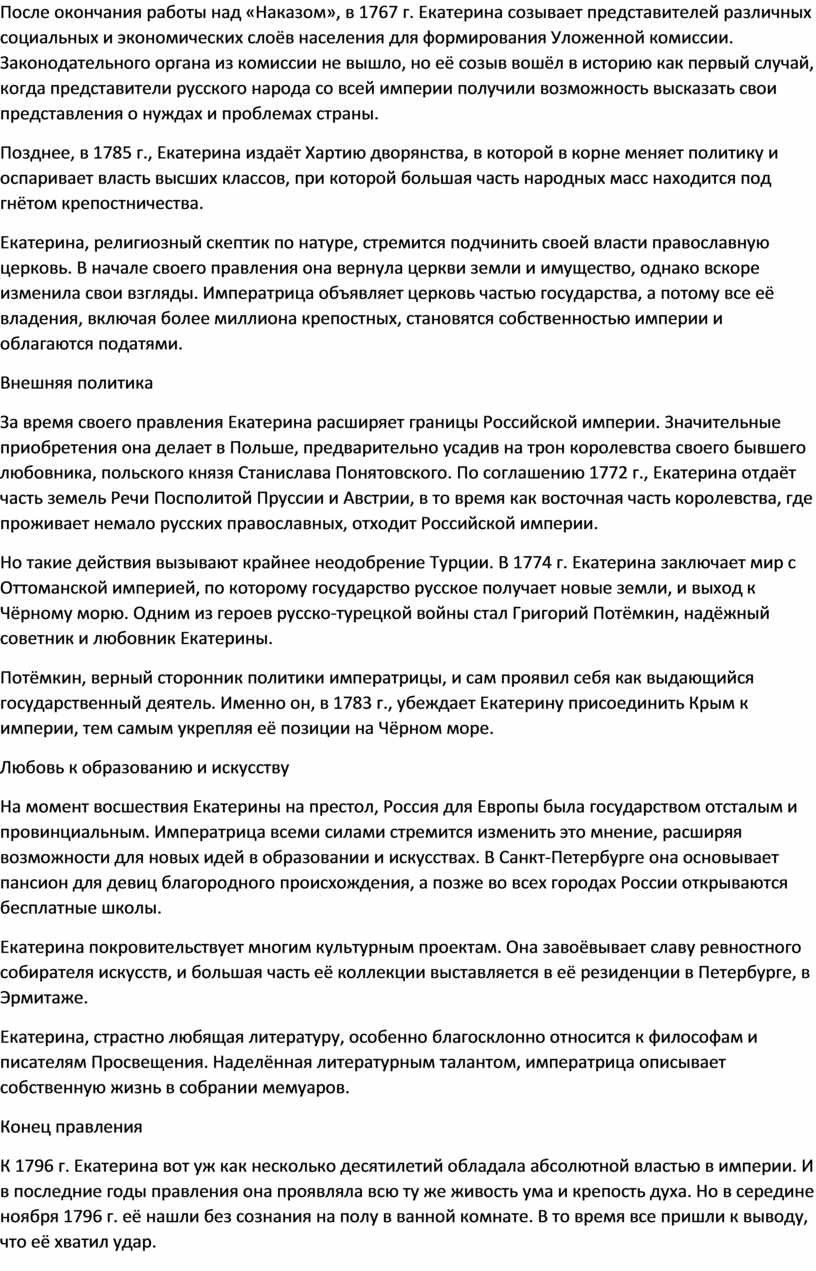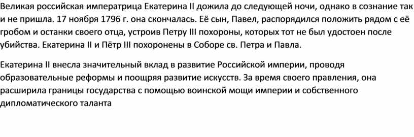 Екатерина II внесла значительный вклад в развитие Российской империи, проводя образовательные реформы и поощряя развитие искусств. За время своего правления, она расширила границы государства с помощью воинской мощи империи и собственного дипломатического таланта