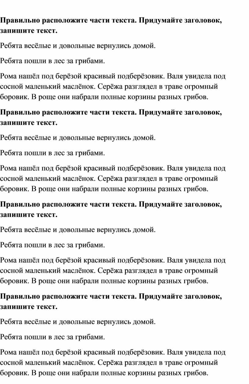 Правильно расположите части текста. Придумайте заголовок, запишите текст.