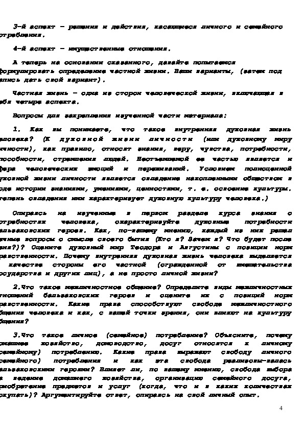 Цели: раскрыть важнейшие аспекты частной жизни человека; показать