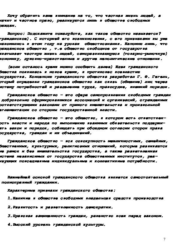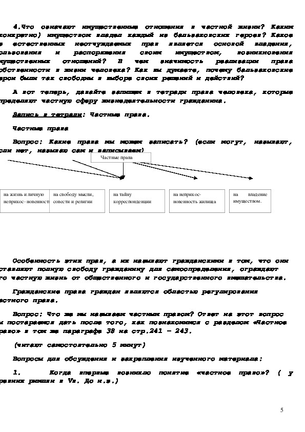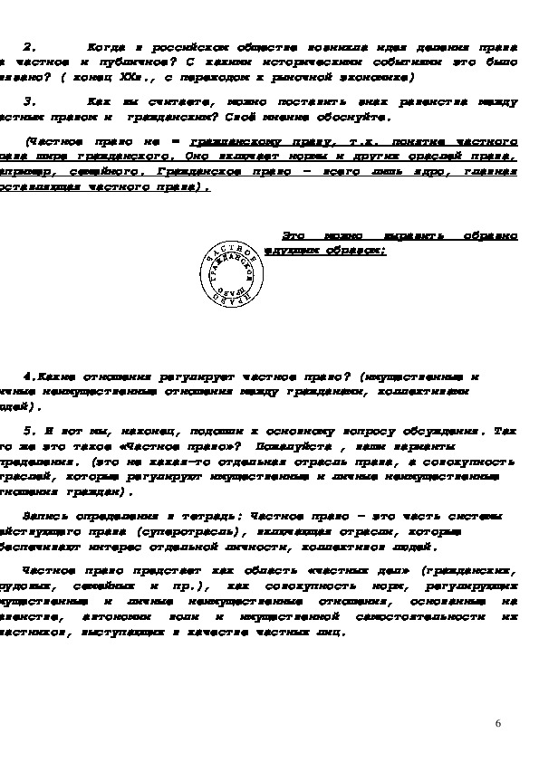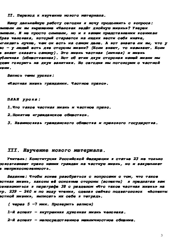 Цели: раскрыть важнейшие аспекты частной жизни человека; показать признаки и функции гражданского общества и правового государства.
