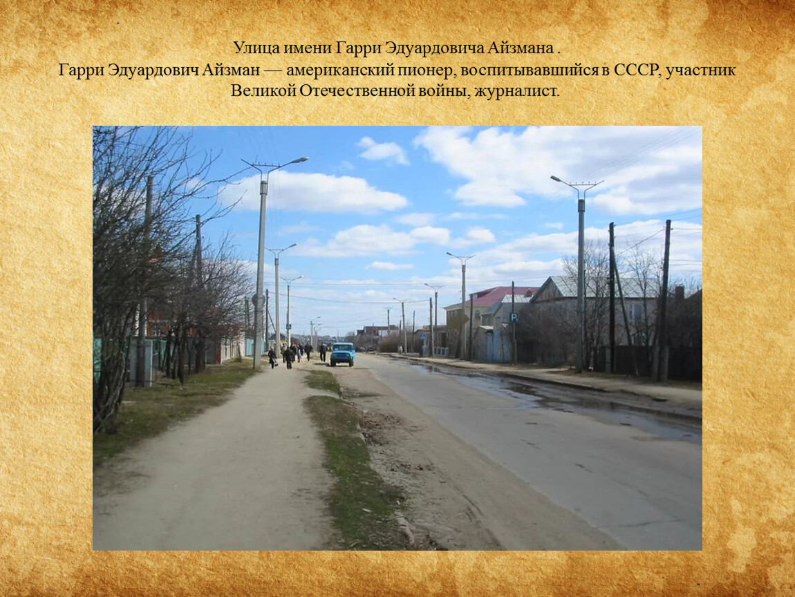 Улица имени Гарри Эдуардовича Айзмана .Гарри Эдуардович Айзман — американский пионер, воспитывавшийся в СССР, участник Великой Отечественной войны, журналист.