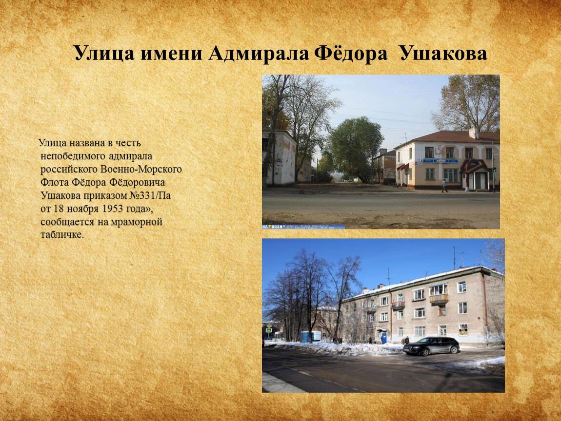 Улица названа в честь непобедимого адмирала российского Военно-Морского Флота Фёдора Фёдоровича Ушакова приказом №331/Па от 18 ноября 1953 года», сообщается на мраморной табличке.