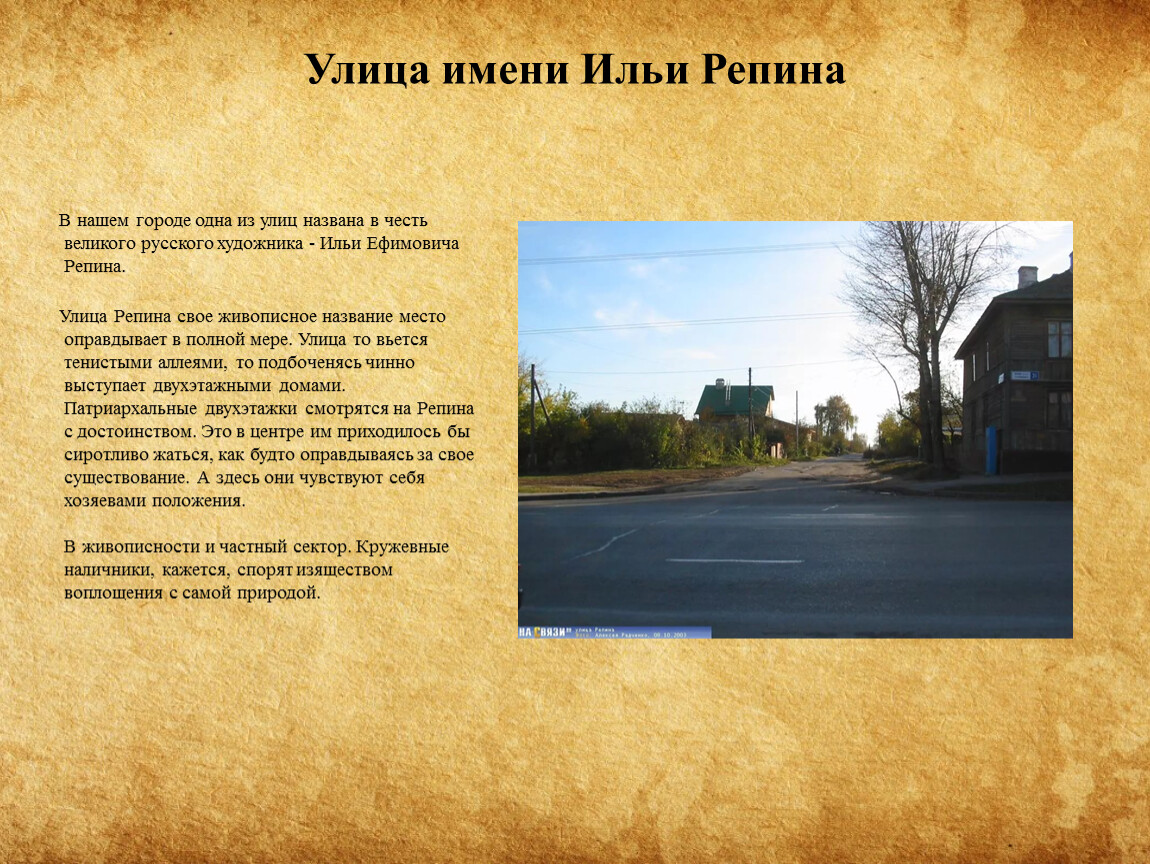 Улица Репина свое живописное название место оправдывает в полной мере. Улица то вьется тенистыми аллеями, то подбоченясь чинно выступает двухэтажными домами. Патриархальные двухэтажки смотрятся на Репина с достоинством. Это в центре им приходилось бы сиротливо жаться, как будто оправдываясь за свое существование. А здесь они чувствуют себя хозяевами положения. В живописности и частный сектор. Кружевные наличники, кажется, спорят изяществом воплощения с самой природой.