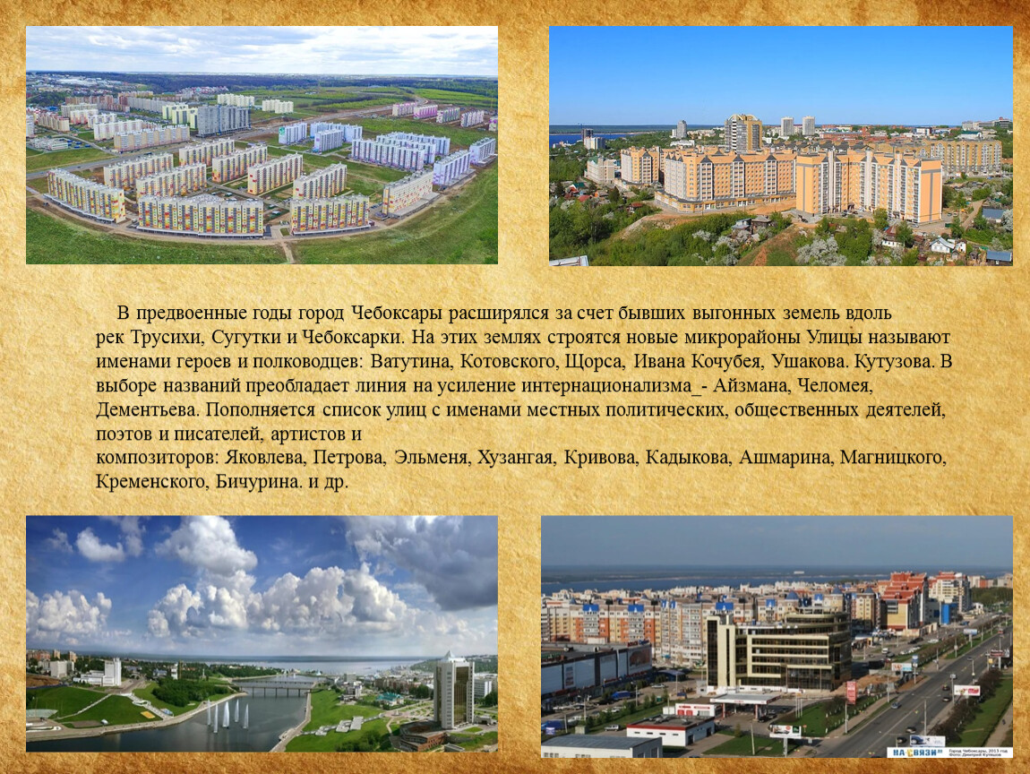 В предвоенные годы город Чебоксары расширялся за счет бывших выгонных земель вдоль рек Трусихи, Сугутки и Чебоксарки. На этих землях строятся новые микрорайоны Улицы называют именами героев и полководцев: Ватутина, Котовского, Щорса, Ивана Кочубея, Ушакова. Кутузова. В выборе названий преобладает линия на усиление интернационализма_- Айзмана, Челомея, Дементьева. Пополняется список улиц с именами местных политических, общественных деятелей, поэтов и писателей, артистов и композиторов: Яковлева, Петрова, Эльменя, Хузангая, Кривова, Кадыкова, Ашмарина, Магницкого, Кременского, Бичурина. и др.