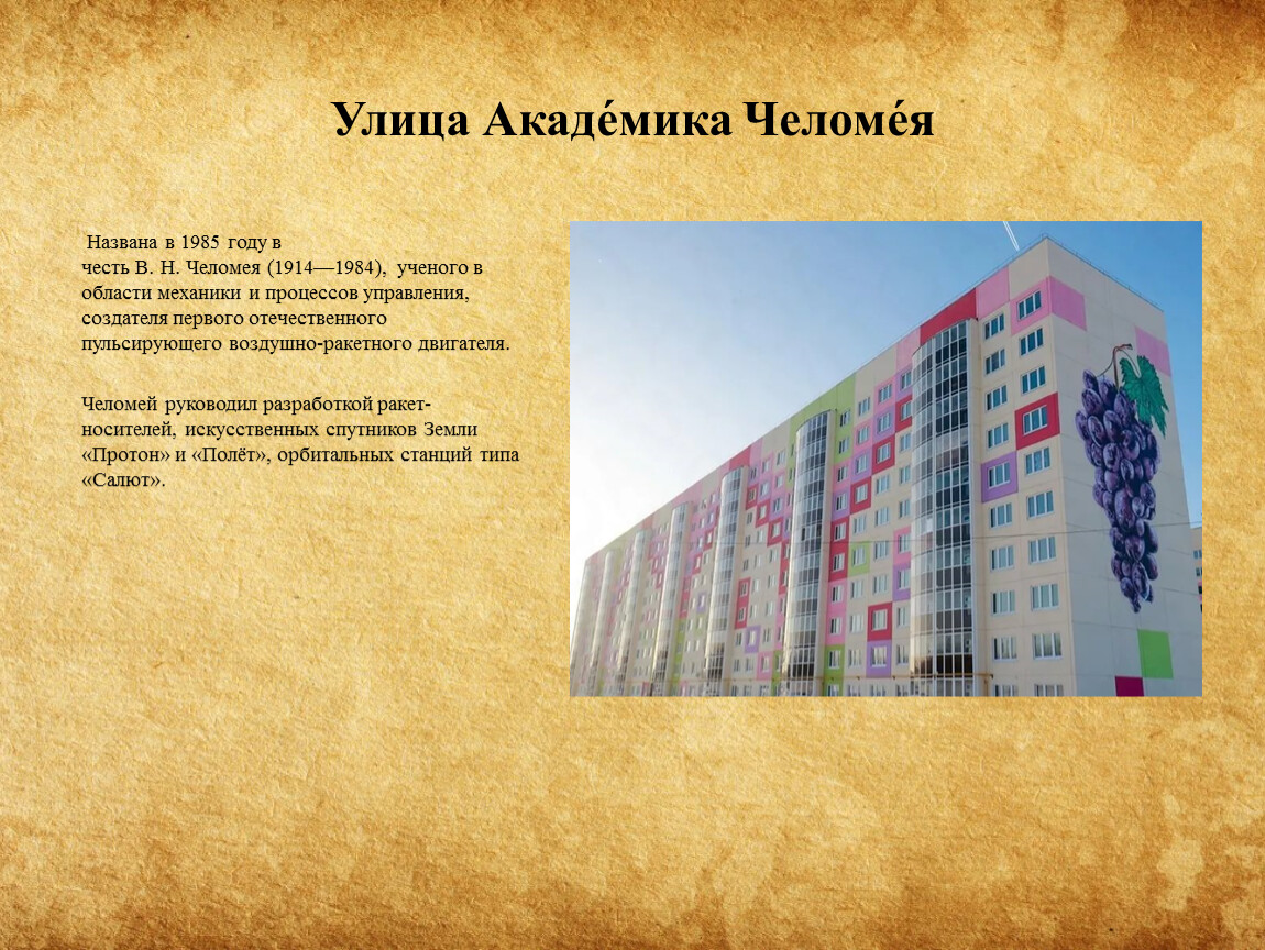 Названа в 1985 году в честь В. Н. Челомея (1914—1984), ученого в области механики и процессов управления, создателя первого отечественного пульсирующего воздушно-ракетного двигателя.