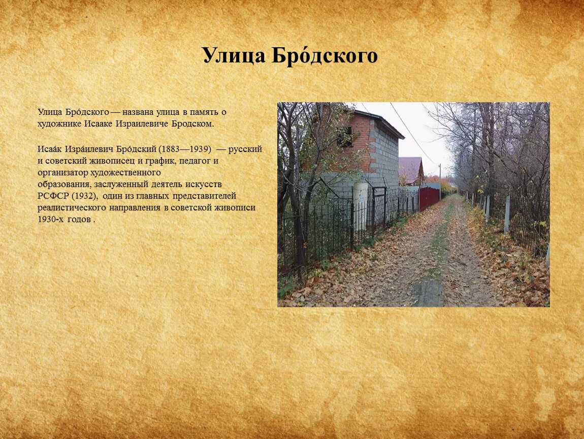 Улица Бро́дского — названа улица в память о художнике Исааке Израилевиче Бродском.