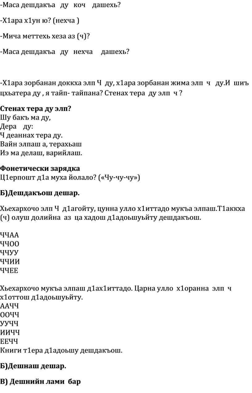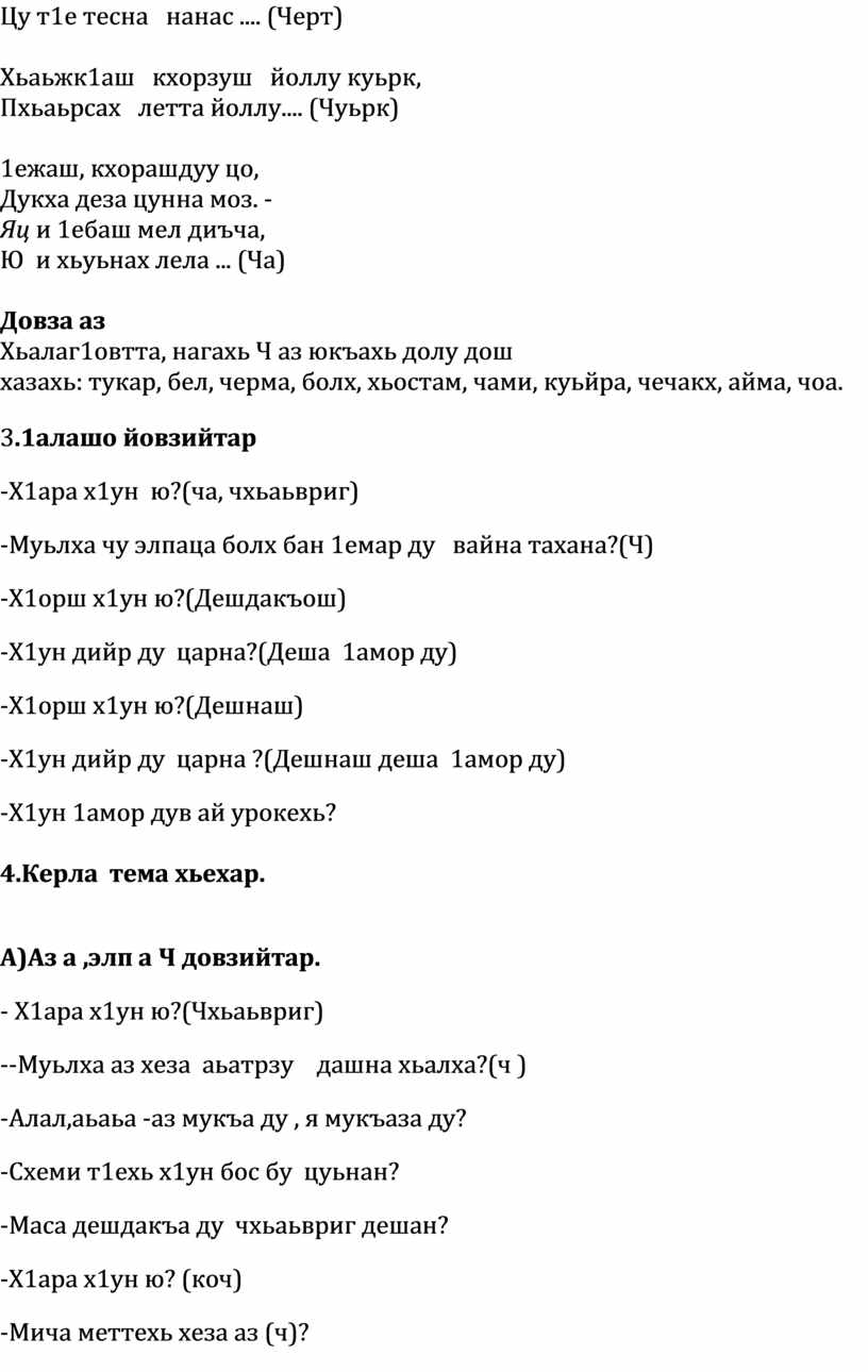 1.Предметни:Аз а, элп а Ч довзийтар, мукъа хилар хаийтар, Ч элп юкъадог1у дешнаш деша 1амор.