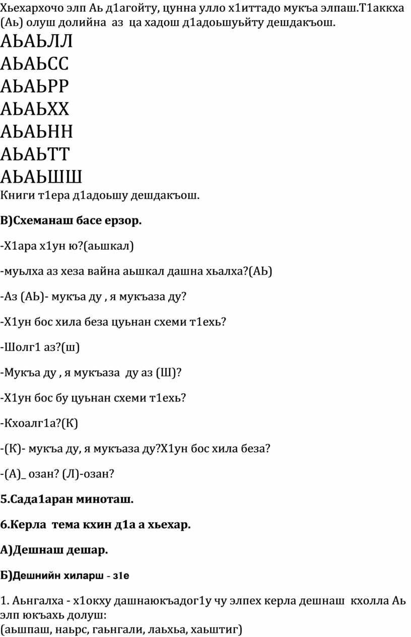 1.Предметни:Аз а, элп а Аь довзийтар, мукъа шалха хилар хаийтар, Аь элп юкъадог1у дешнаш деша 1амор.
