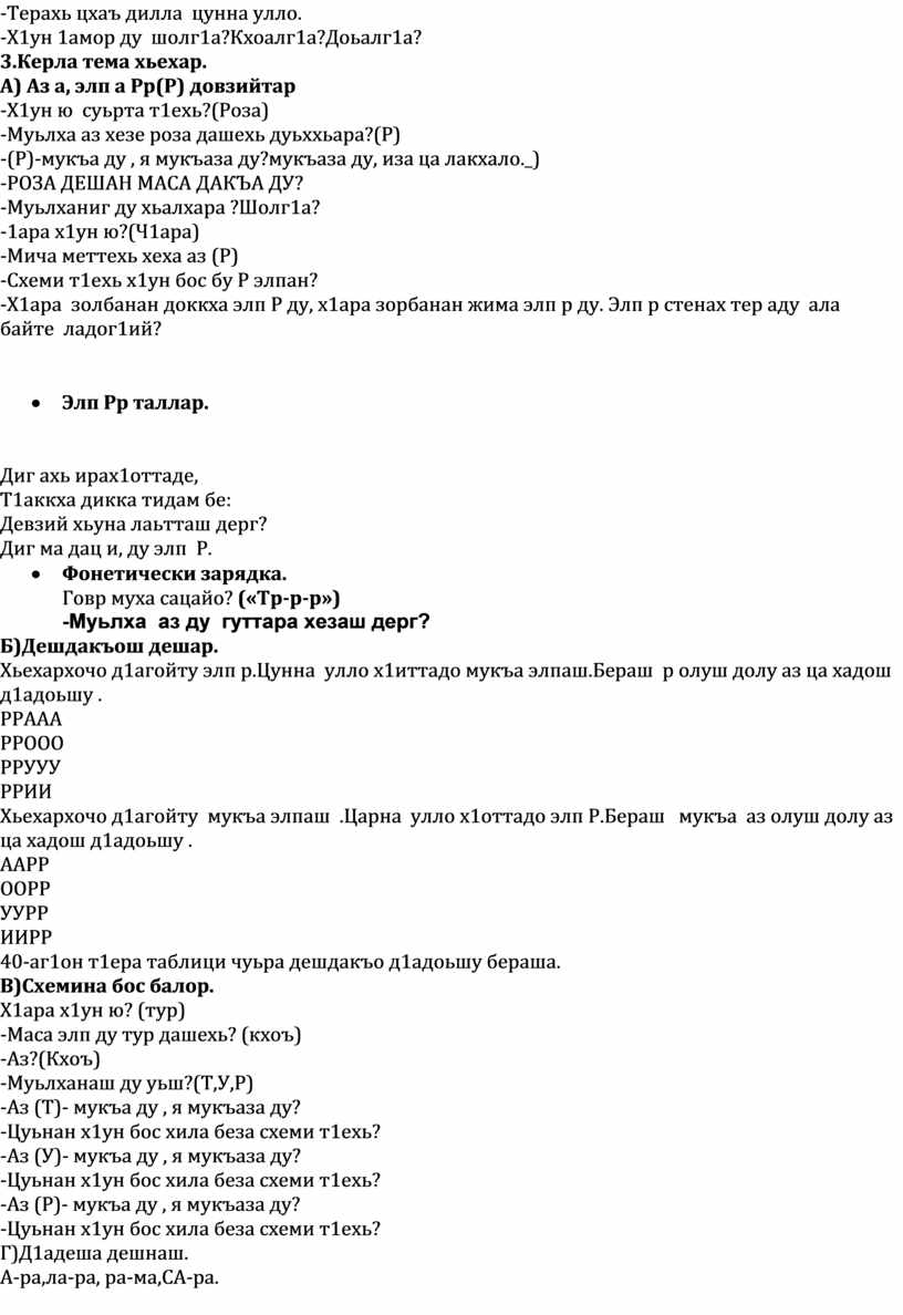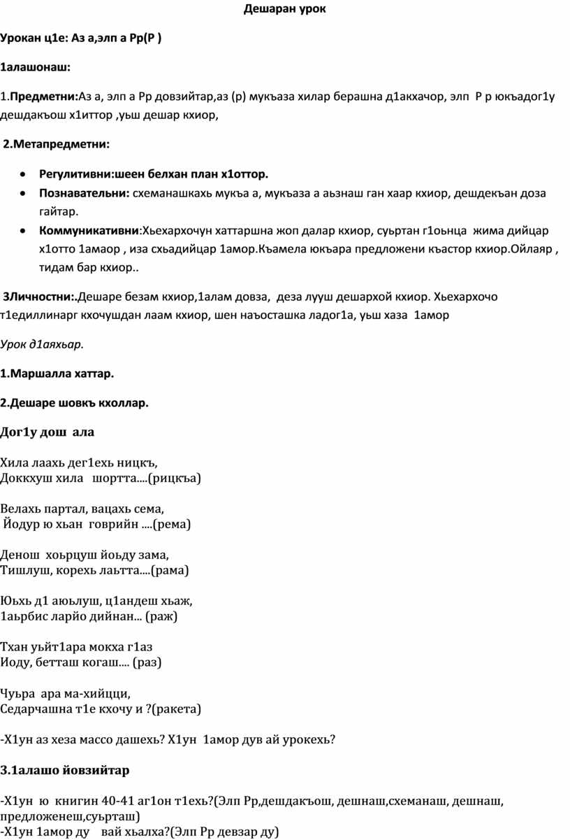 1.Предметни:Аз а, элп а Рр довзийтар,аз (р) мукъаза хилар берашна д1акхачор, элп Р р юкъадог1у дешдакъош х1иттор ,уьш дешар кхиор,