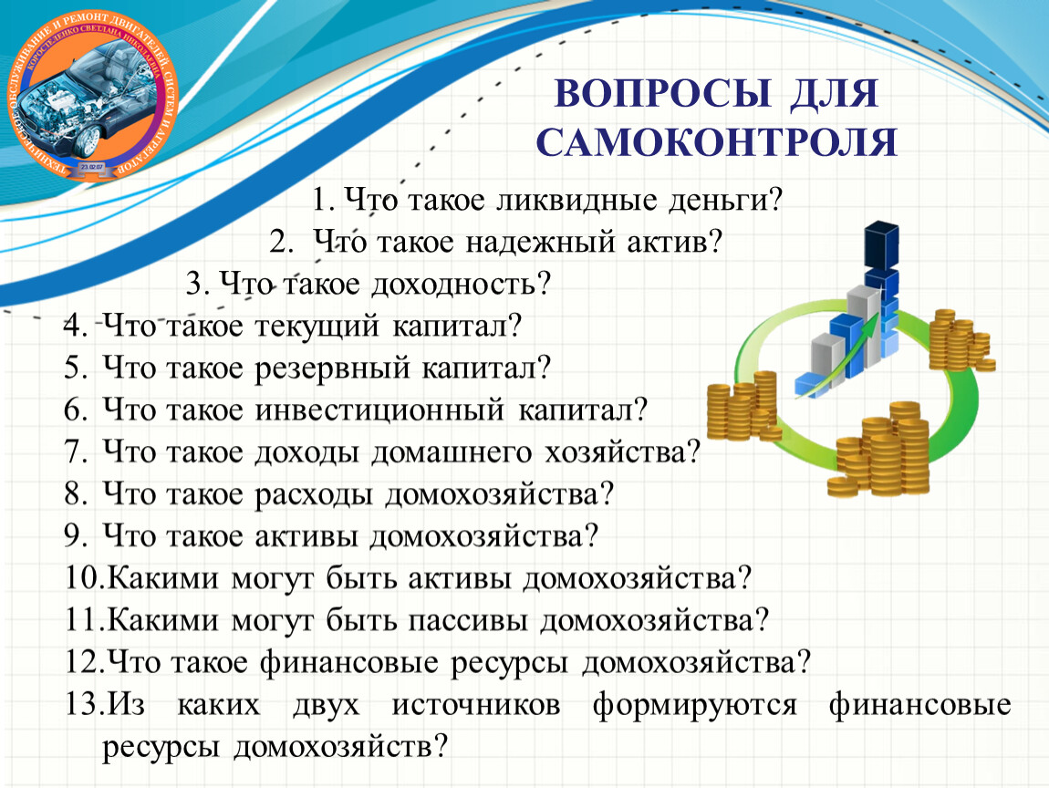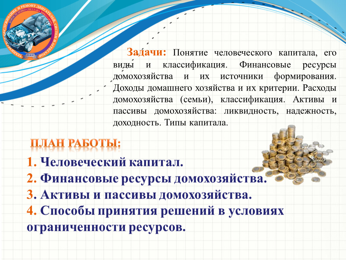 Задачи: Понятие человеческого капитала, его виды и классификация. Финансовые ресурсы домохозяйства и их источники формирования. Доходы домашнего хозяйства и их критерии. Расходы домохозяйства (семьи), классификация. Активы и пассивы домохозяйства: ликвидность, надежность, доходность. Типы капитала.