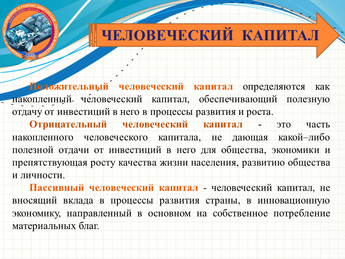 Положительный человеческий капитал определяются как накопленный человеческий капитал, обеспечивающий полезную отдачу от инвестиций в него в процессы развития и роста.