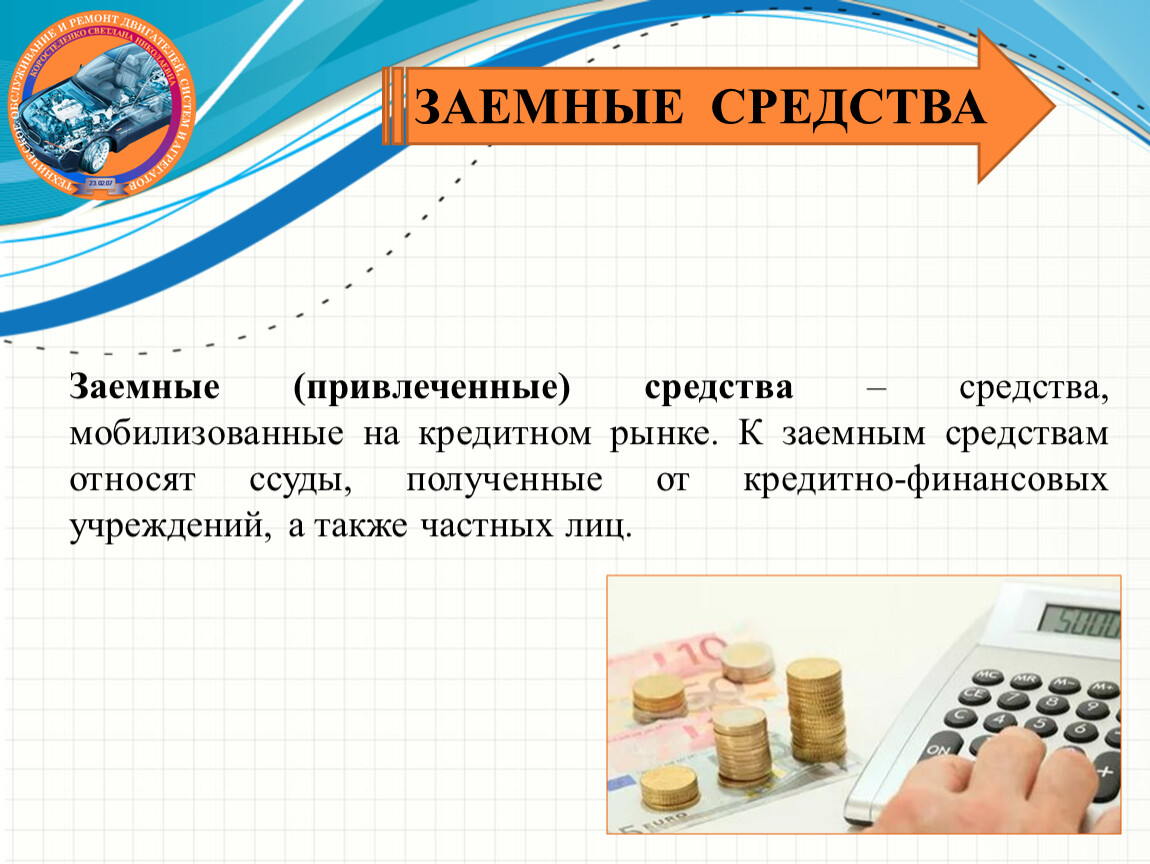 Заемные (привлеченные) средства – средства, мобилизованные на кредитном рынке. К заемным средствам относят ссуды, полученные от кредитно-финансовых учреждений, а также частных лиц.
