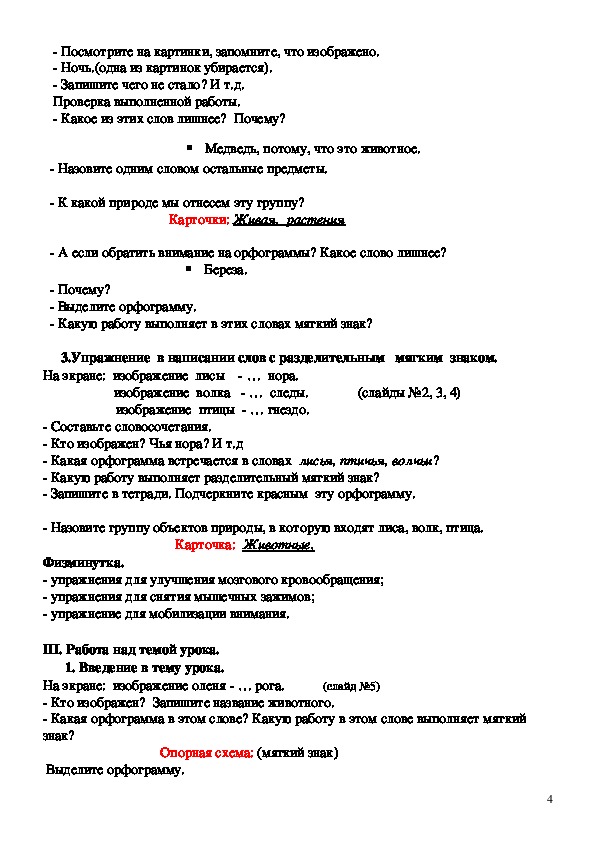 - упражнять уч-ся в различении слов с разделительным мягким знаком и мягким знаком, обозначающим мягкость согласного; обобщить знания учащихся о разделительном мягком знаке, о мягком знаке, обозначающим мягкость согласного; дать представления о том, что человек - часть природы, о его взаимоотношениях с природой; формировать основы экологической грамотности;