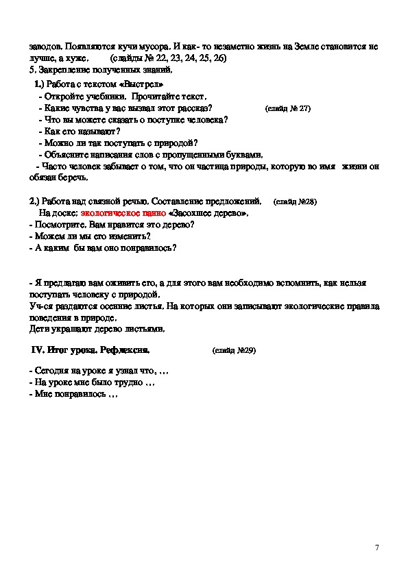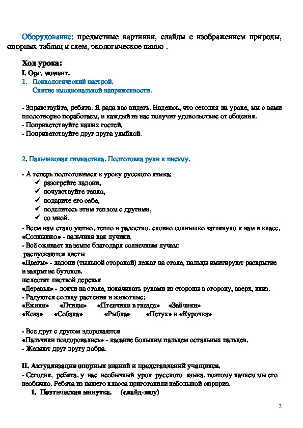 позиции по защите и сохранению окружающей среды;Оборудование: предметные картинки, слайды с изображением природы,