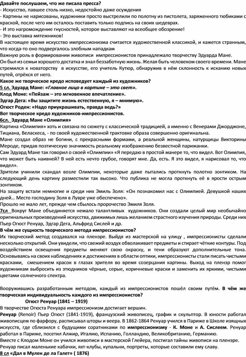 Цель: познакомить учащихся с творческими принципами импрессионистов, с их стремлением раскрыть средствами живописи взаимосвязь человека и окружающей среды, показать красоту природы, научить людей ценить её, обратить внимание учащихся на новую технику письма импрессионистов на примере работ Э.Мане, К. Моне, Э. Дега, О. Ренуара.