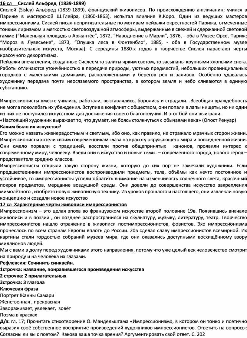 Д/з: гл. 17; Прочитать стихотворение О. Мандельштама «Импрессионизм», в котором он тонко и поэтично выразил своё собственное восприятие произведений художников-импрессионистов. Ответить на вопросы: Согласны ли вы с поэтом? Какова ваша точка зрения? Аргументировать свой ответ. С. 202