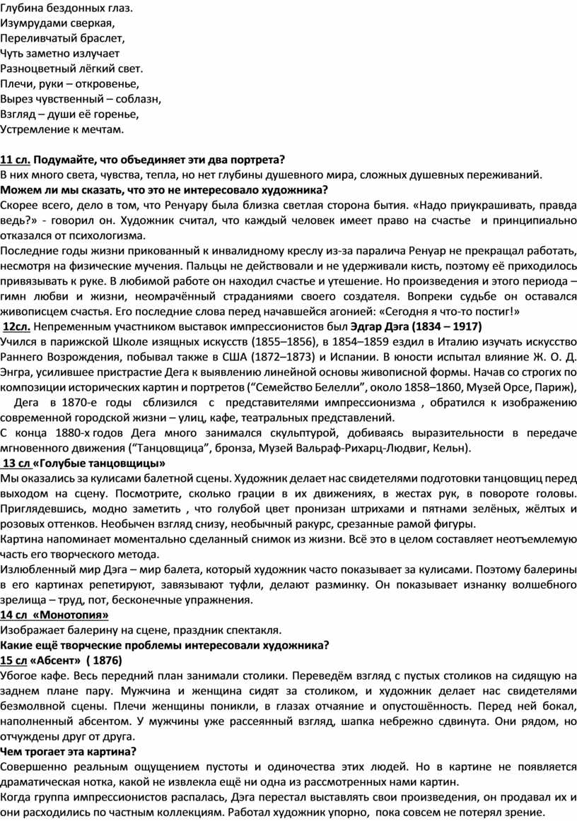 Дега в 1870-е годы сблизился с представителями импрессионизма , обратился к изображению современной городской жизни – улиц, кафе, театральных представлений.