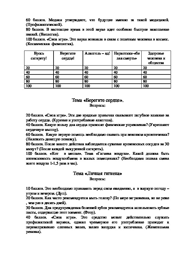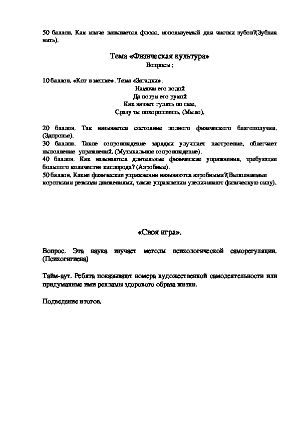 8. Для каждого раунда ведущийЦели: расширять и систематизировать знания учащихся о личной гигиене; правильно сориентировать учащихся в вопросах режима питания; формировать тенденции и установки к здоровому образу жизни.