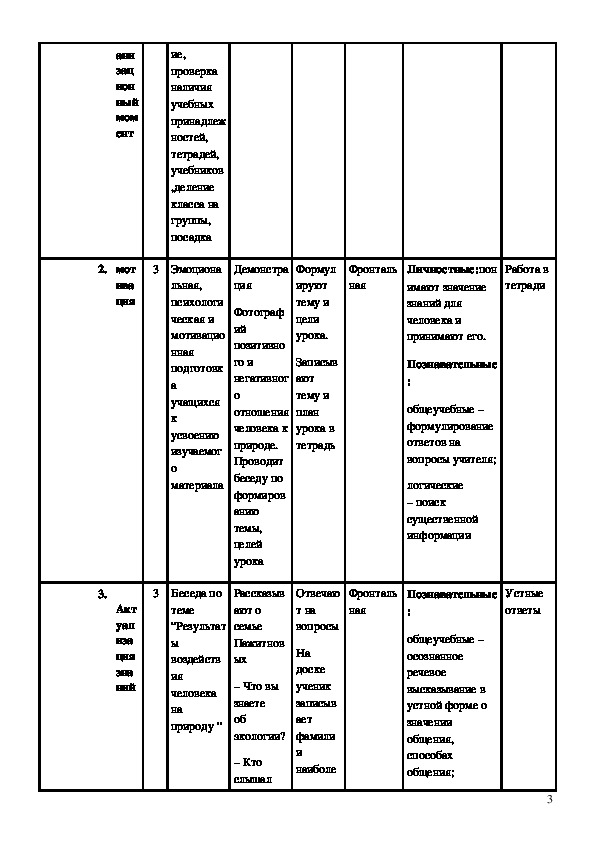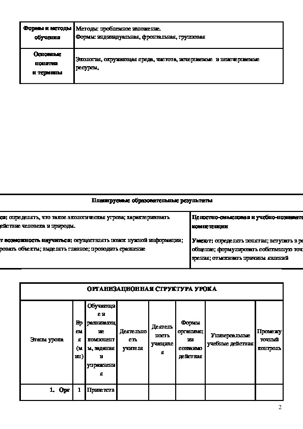 ОРГАНИЗАЦИОННАЯ СТРУКТУРА УРОКА