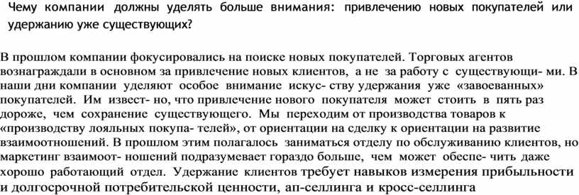 В прошлом компании фокусировались на поиске новых покупателей. Торговых агентов вознаграждали в основном за привлечение новых клиентов, а не за работу с существующи ми. В наши дни компании уделяют особое внимание искус ству удержания уже «завоеванных» покупателей. Им извест но, что привлечение нового покупателя может стоить в пять раз дороже, чем сохранение существующего. Мы переходим от производства товаров к «производству лояльных покупа телей», от ориентации на сделку к ориентации на развитие взаимоотношений. В прошлом этим полагалось заниматься отделу по обслуживанию клиентов, но маркетинг взаимоот ношений подразумевает гораздо больше, чем может обеспе чить даже хорошо работающий отдел. Удержание клиентов требует навыков измерения прибыльности и долгосрочной потребительской ценности, ап-селлинга и кросс-селлинга