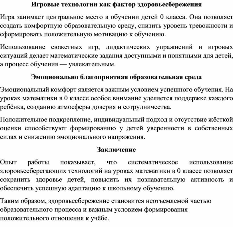 Здоровьесберегающие технологии позволяют выстроить обучение таким образом, чтобы ребёнок не испытывал перегрузки, а процесс познания вызывал положительные эмоции. Их использование на уроках математики способствует формированию устойчивого интереса к предмету и сохранению здоровья обучающихся.