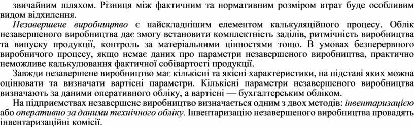 Аналогічні натуральні (кількісні та якісні) характеристики мають й інші вихідні елементи виробництва: відходи, брак, незавершене виробництво. Таким чином, усі названі вихідні елементи процесу виробництва стають об’єктами калькуляції фактичної собівартості готової продукції. Їх наявність або відсутність ускладнює або полегшує (спрощує) процедуру калькулювання. А поєднання визначає метод (або спосіб) калькуляції.
