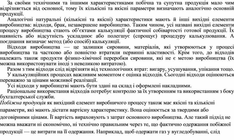 На відміну від побіжної побічна продукція не потребує додаткових витрат. Така продукція утворюється в комплексних виробництвах паралельно з основною. Для калькулювання собівартості основної продукції потрібно попередньо визначити кількісні, якісні та вартісні параметри побічної продукції.