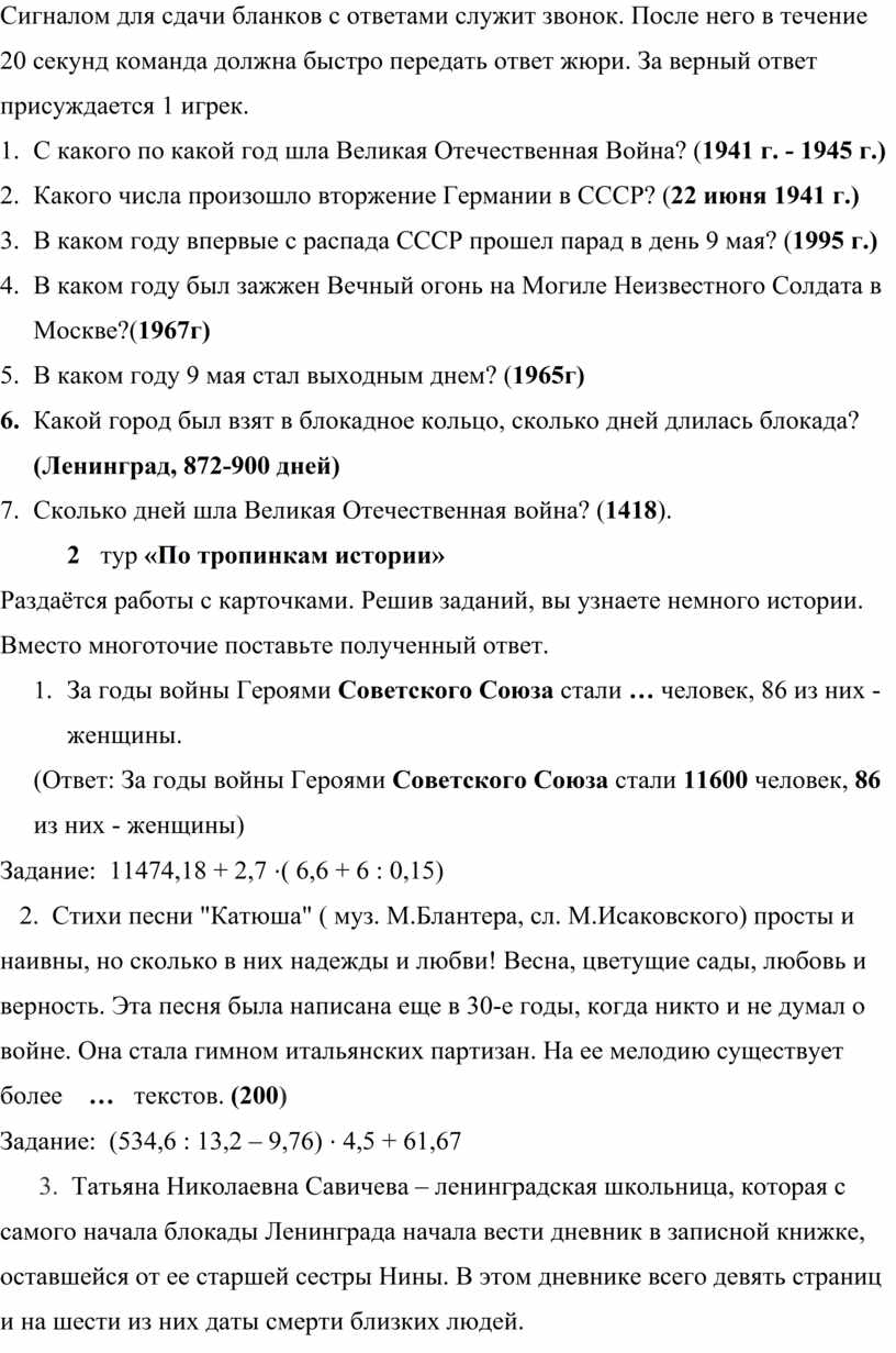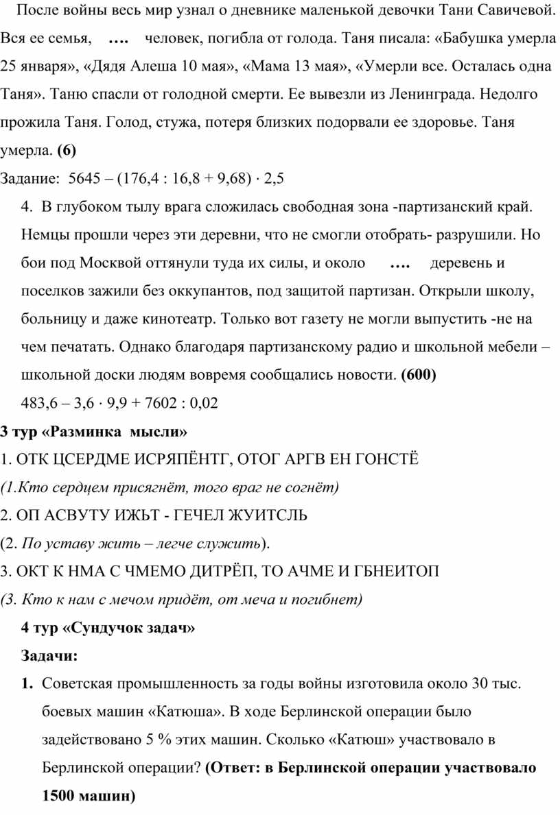 1. Советская промышленность за годы войны изготовила около 30 тыс. боевых машин «Катюша». В ходе Берлинской операции было задействовано 5 % этих машин. Сколько «Катюш» участвовало в Берлинской операции? (Ответ: в Берлинской операции участвовало 1500 машин)