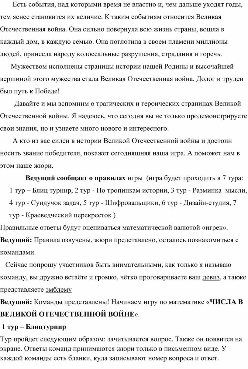 Ведущий: Команды представлены! Начинаем игру по математике «ЧИСЛА В ВЕЛИКОЙ ОТЕЧЕСТВЕННОЙ ВОЙНЕ».