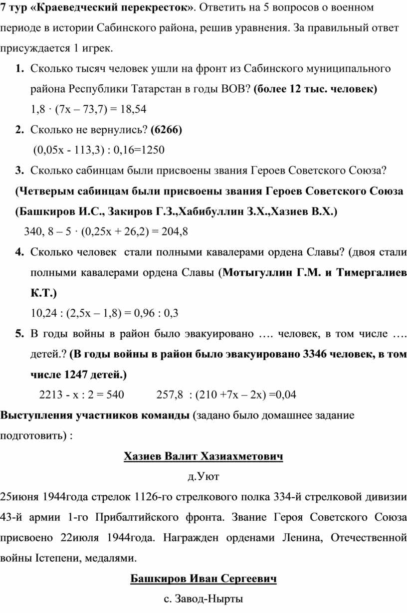 7 тур «Краеведческий перекресток». Ответить на 5 вопросов о военном периоде в истории Сабинского района, решив уравнения. За правильный ответ присуждается 1 игрек.