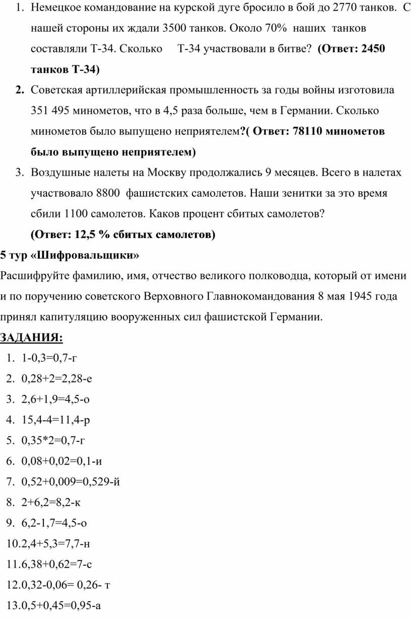 2. Немецкое командование на курской дуге бросило в бой до 2770 танков. С нашей стороны их ждали 3500 танков. Около 70% наших танков составляли Т-34. Сколько Т-34 участвовали в битве? (Ответ: 2450 танков Т-34)