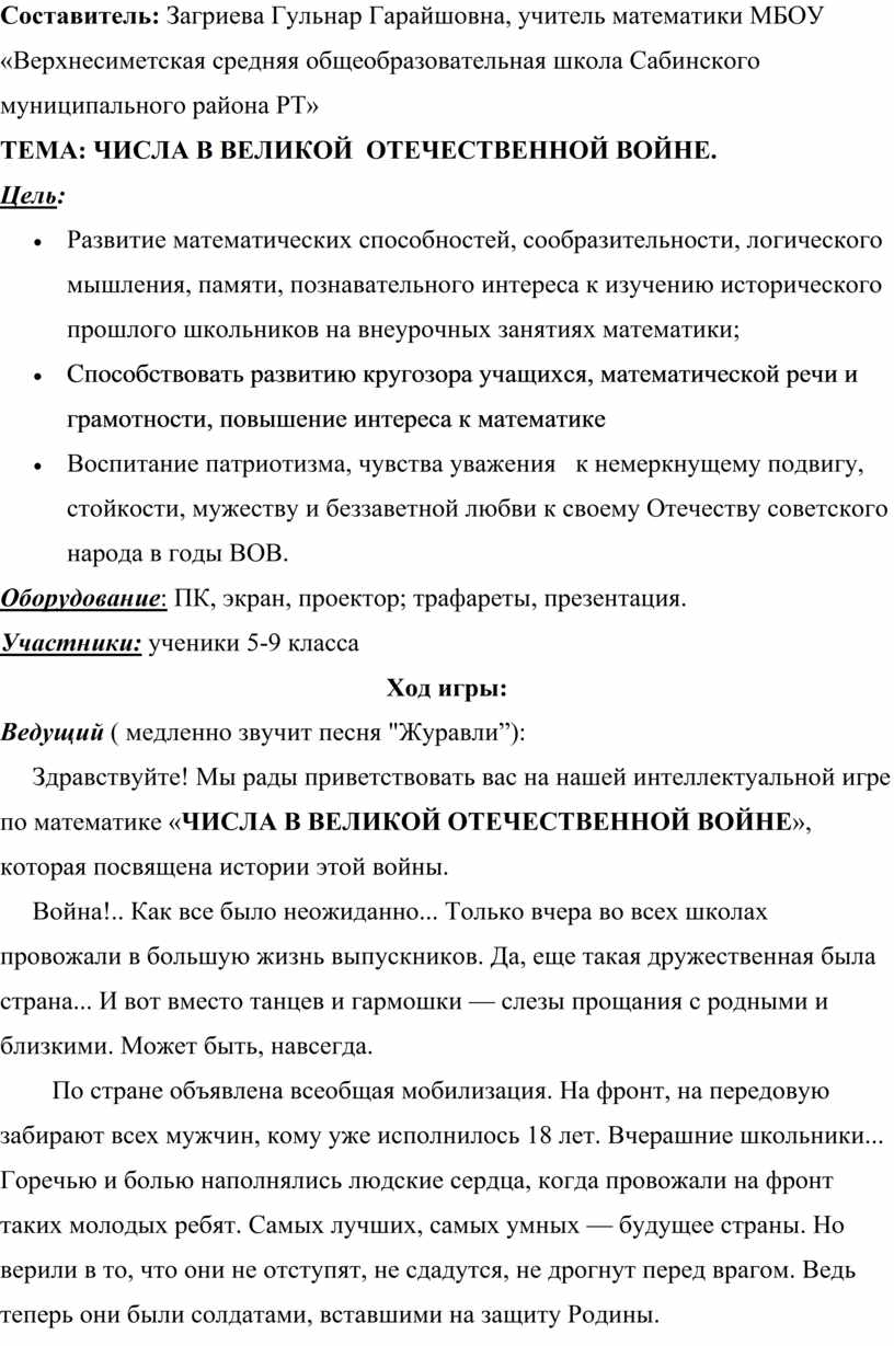 Здравствуйте! Мы рады приветствовать вас на нашей интеллектуальной игре по математике «ЧИСЛА В ВЕЛИКОЙ ОТЕЧЕСТВЕННОЙ ВОЙНЕ», которая посвящена истории этой войны.
