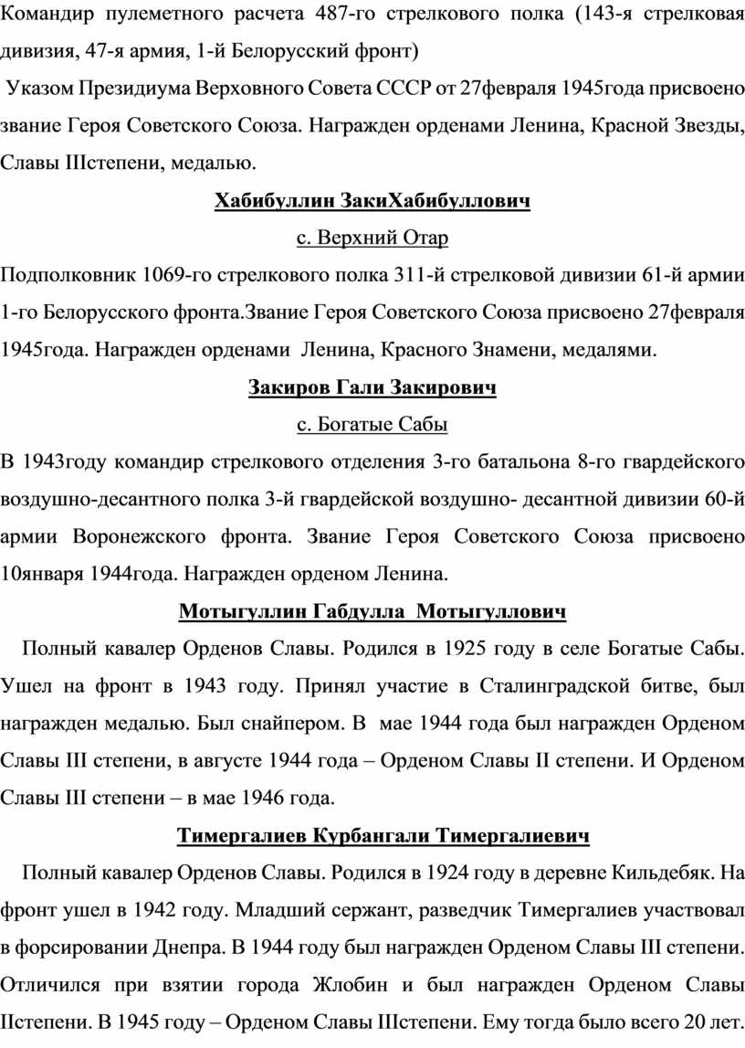 (Четверым сабинцам были присвоены звания Героев Советского Союза (Башкиров И.С., Закиров Г.З.,Хабибуллин З.Х.,Хазиев В.Х.)