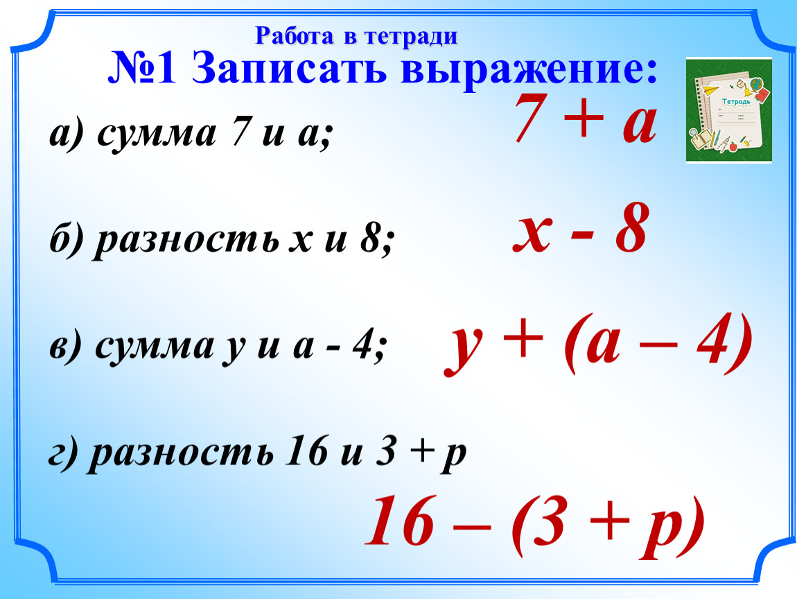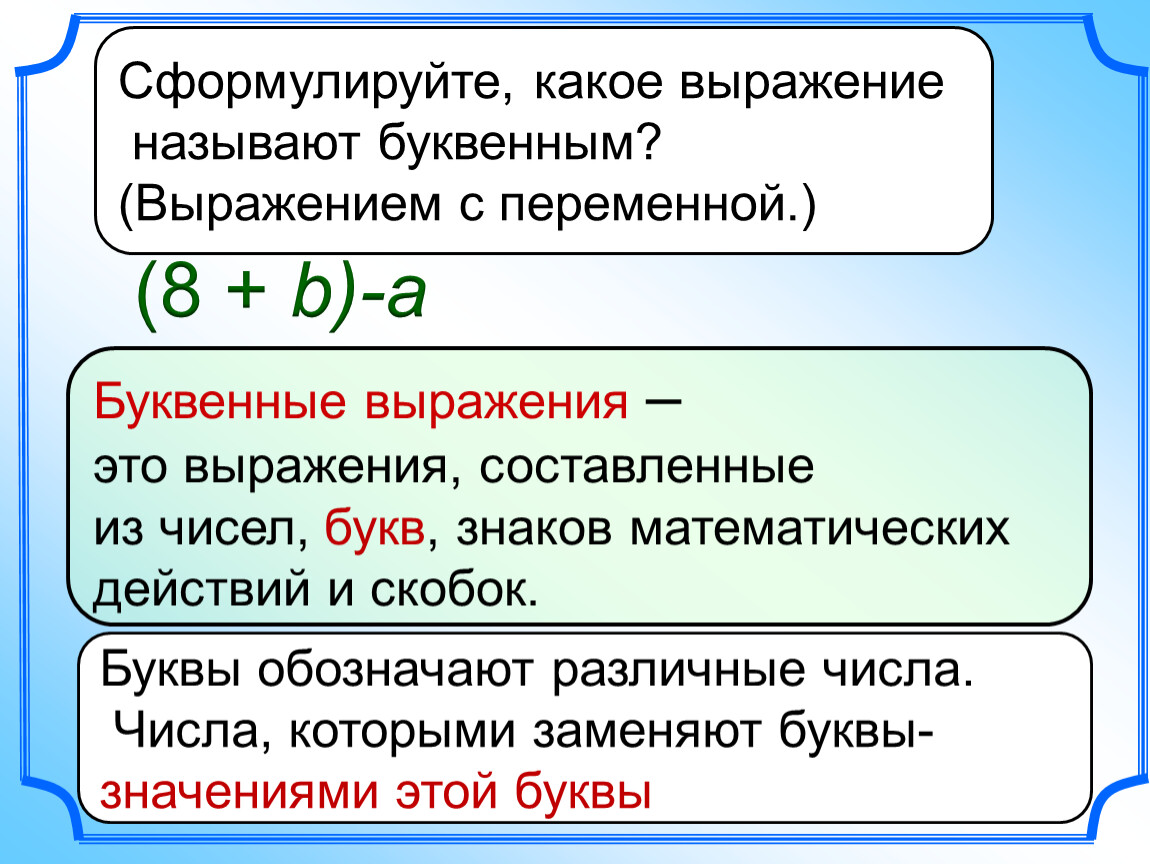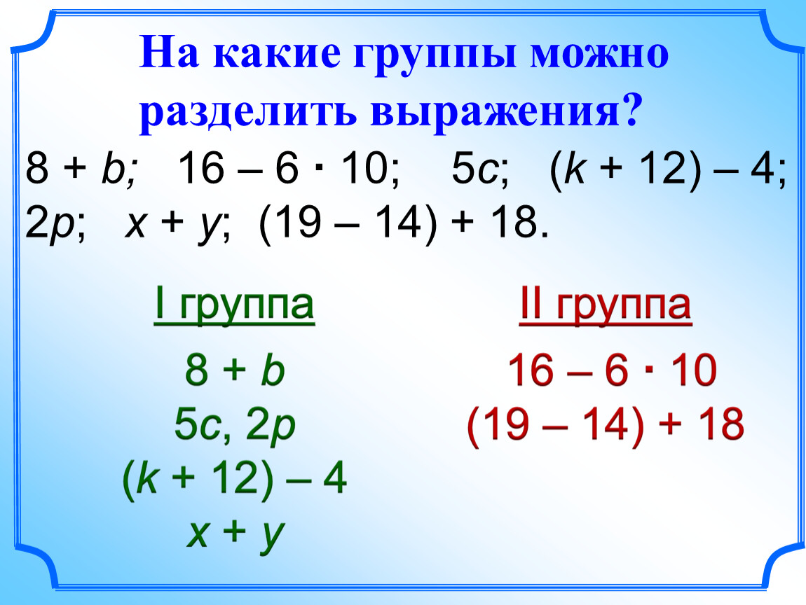 8 + b; 16 – 6 10; 5c; (k + 12) – 4; 2p; x + y; (19 – 14) + 18.