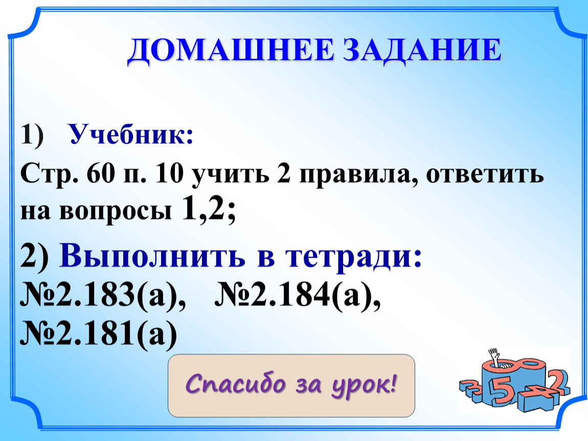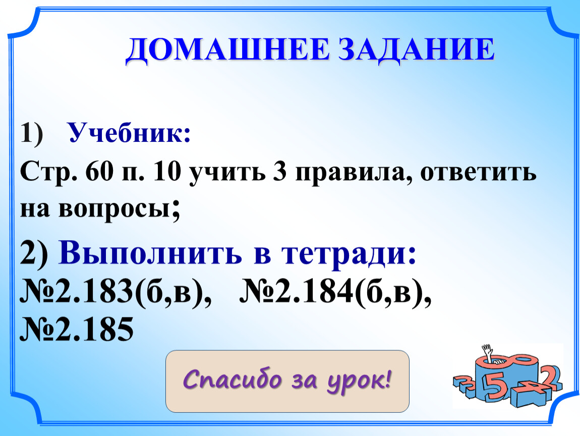 Стр. 60 п. 10 учить 2 правила, ответить на вопросы 1,2;