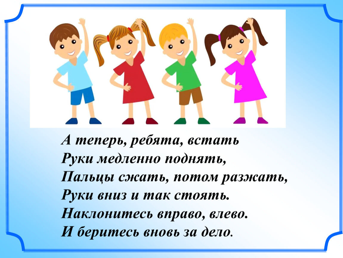 А теперь, ребята, встатьРуки медленно поднять,Пальцы сжать, потом разжать,Руки вниз и так стоять.Наклонитесь вправо, влево.И беритесь вновь за дело.