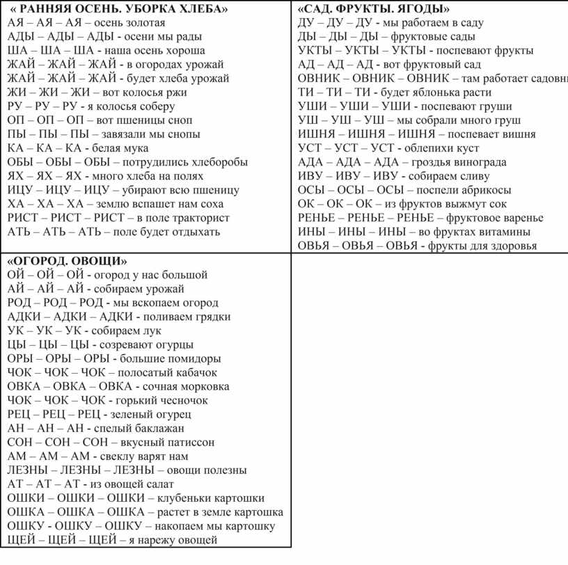 «САД. ФРУКТЫ. ЯГОДЫ» ДУ – ДУ – ДУ - мы работаем в саду ДЫ – ДЫ – ДЫ – фруктовые сады УКТЫ – УКТЫ – УКТЫ - поспевают фрукты АД – АД – АД - вот фруктовый сад ОВНИК – ОВНИК – ОВНИК – там работает садовник ТИ – ТИ – ТИ - будет яблонька расти УШИ – УШИ – УШИ - поспевают груши УШ – УШ – УШ – мы собрали много груш ИШНЯ – ИШНЯ – ИШНЯ – поспевает вишня УСТ – УСТ – УСТ - облепихи куст АДА – АДА – АДА – гроздья винограда ИВУ – ИВУ – ИВУ - собираем сливу ОСЫ – ОСЫ – ОСЫ – поспели абрикосы ОК – ОК – ОК – из фруктов выжмут сок РЕНЬЕ – РЕНЬЕ – РЕНЬЕ – фруктовое варенье ИНЫ – ИНЫ – ИНЫ – во фруктах витамины ОВЬЯ – ОВЬЯ – ОВЬЯ - фрукты для здоровья |