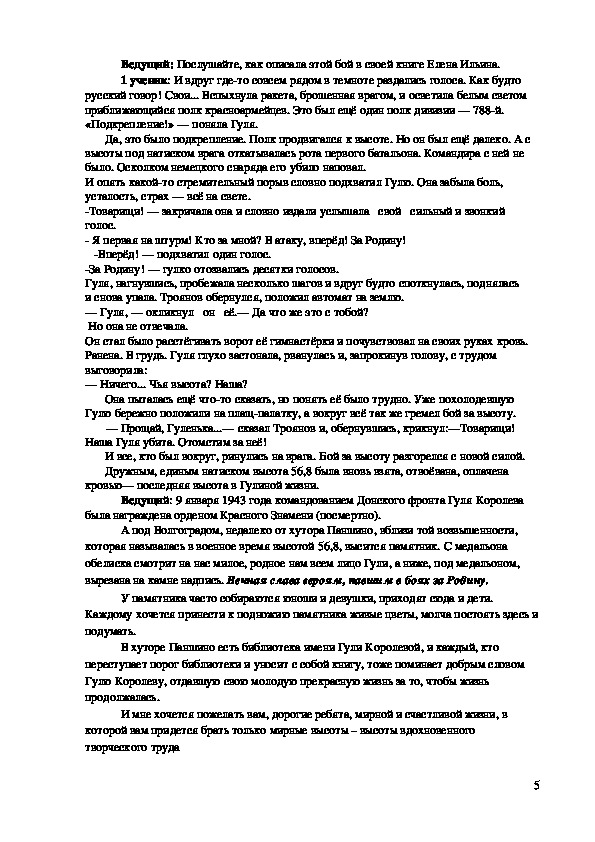 Обращаясь к своим читателям, автор книги «Четвертая высота» Елена Ильина писала: «История этой короткой жизни не выдумана. Девушку, о которой написана эта книга, я знала еще тогда, когда она была ребенком, знала ее также школьницей-пионеркой, комсомолкой. Мне приходилось встречать Гулю Королеву и в дни Отечественной войны. А то в ее жизни, чего мне не удалось увидеть самой, восполнили рассказы ее родителей, учителей, подруг, вожатых. О ее жизни на фронте рассказали мне ее боевые товарищи.