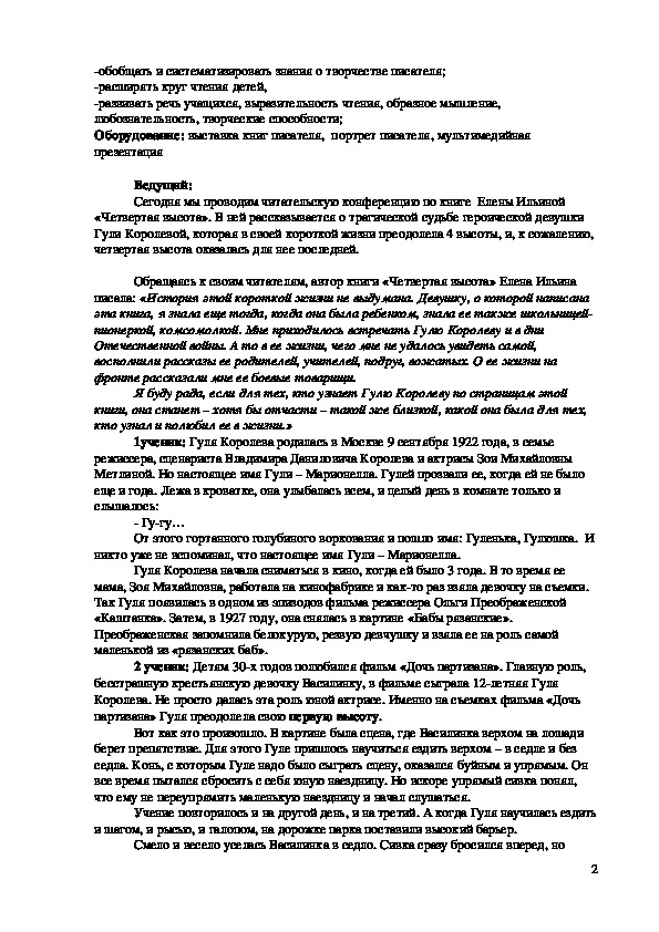 Читательская конференция по книге Е.Ильиной «Четвертая высота»