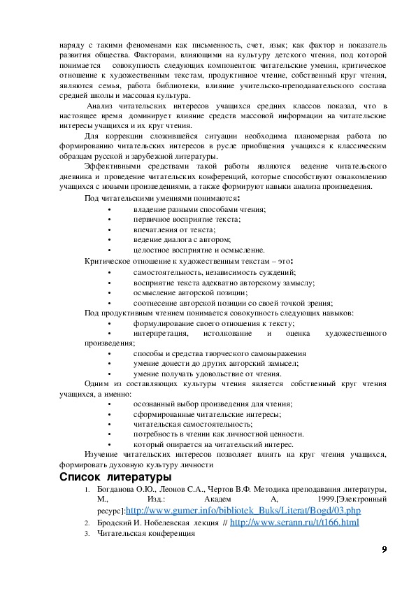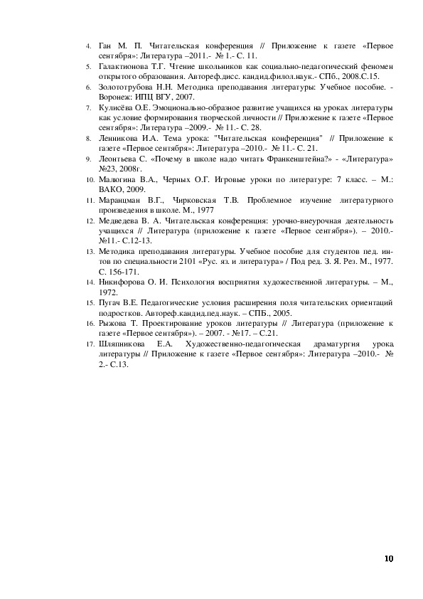 1. Богданова О.Ю., Леонов С.А., Чертов В.Ф. Методика преподавания литературы,
