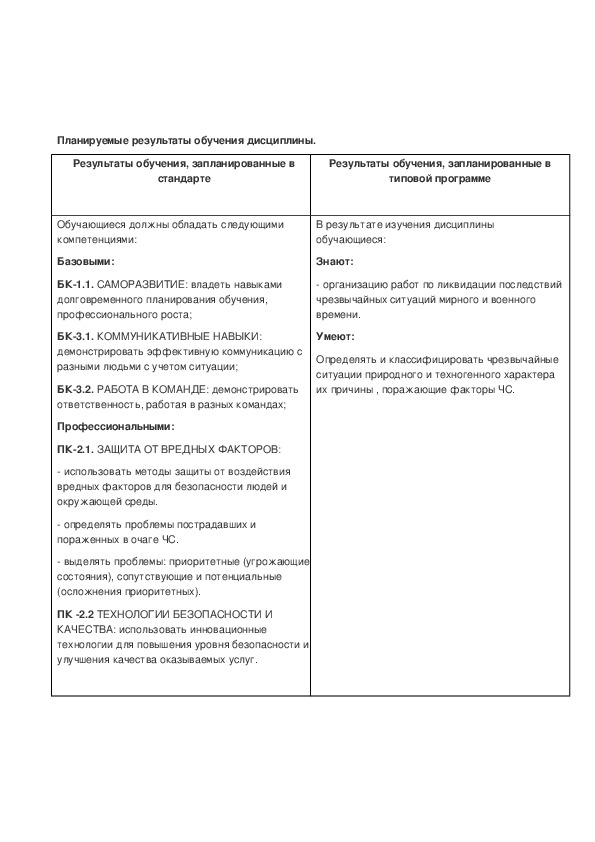 Результаты обучения, запланированные в