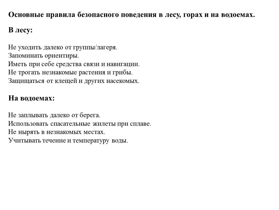 Основные правила безопасного поведения в лесу, горах и на водоемах.