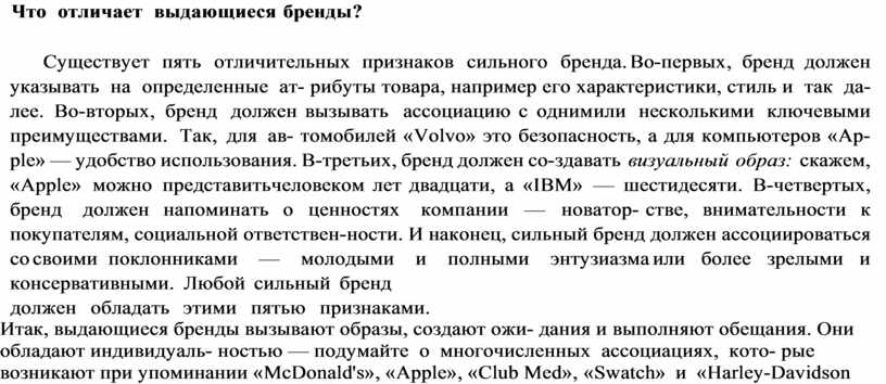 Итак, выдающиеся бренды вызывают образы, создают ожи дания и выполняют обещания. Они обладают индивидуаль ностью — подумайте о многочисленных ассоциациях, кото рые возникают при упоминании «McDonald's», «Apple», «Club Med», «Swatch» и «Harley-Davidson