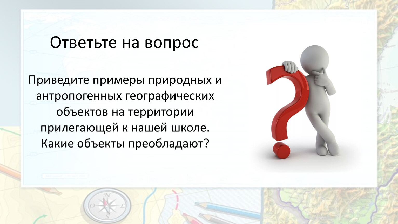 Приведите примеры природных и антропогенных географических объектов на территории прилегающей к нашей школе. Какие объекты преобладают?